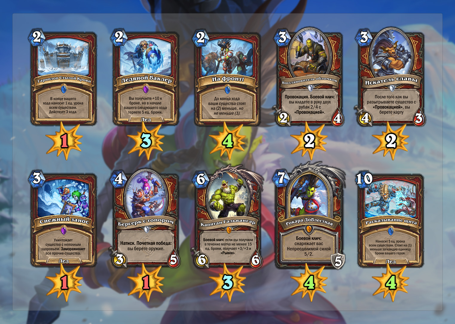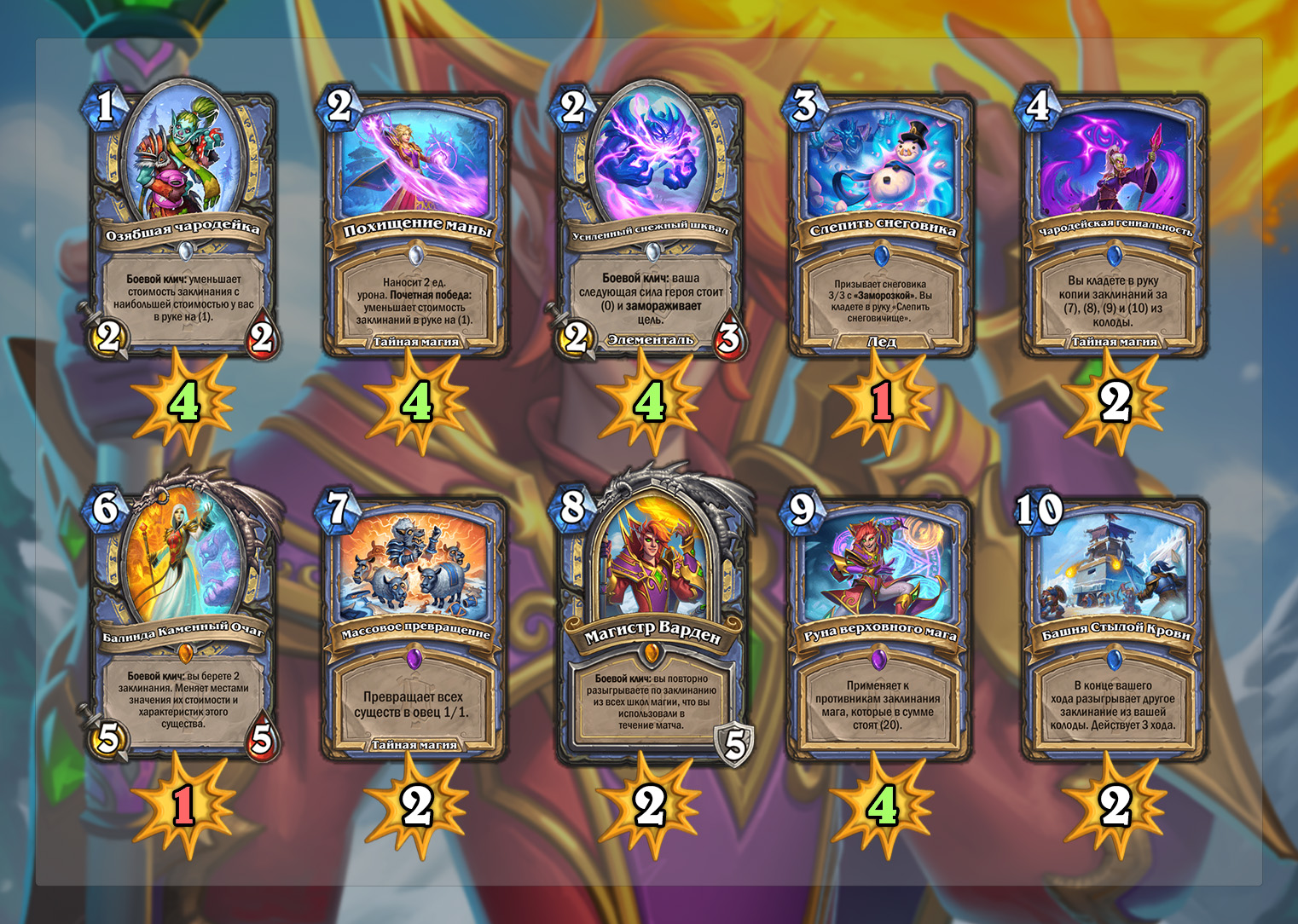 На помощь ему идут очень мощные карты. Похищение маны — внушительная помощь колодам на заклинаниях. Озябшая чародейка производит впечатление универсальной карты для любой колоды. Усиленный снежный шквал значительно повышает выживаемость класса.