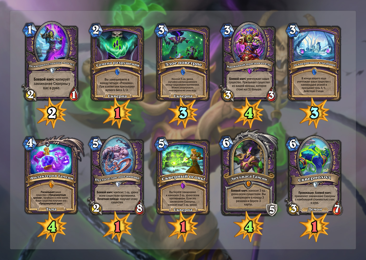 Карты Чернокнижника можно разделить на 2 части. Среди них есть набор Скверны, цель которого не очень ясна, и есть 3 карты, которые можно внести в топ-10 лучших карт дополнения.