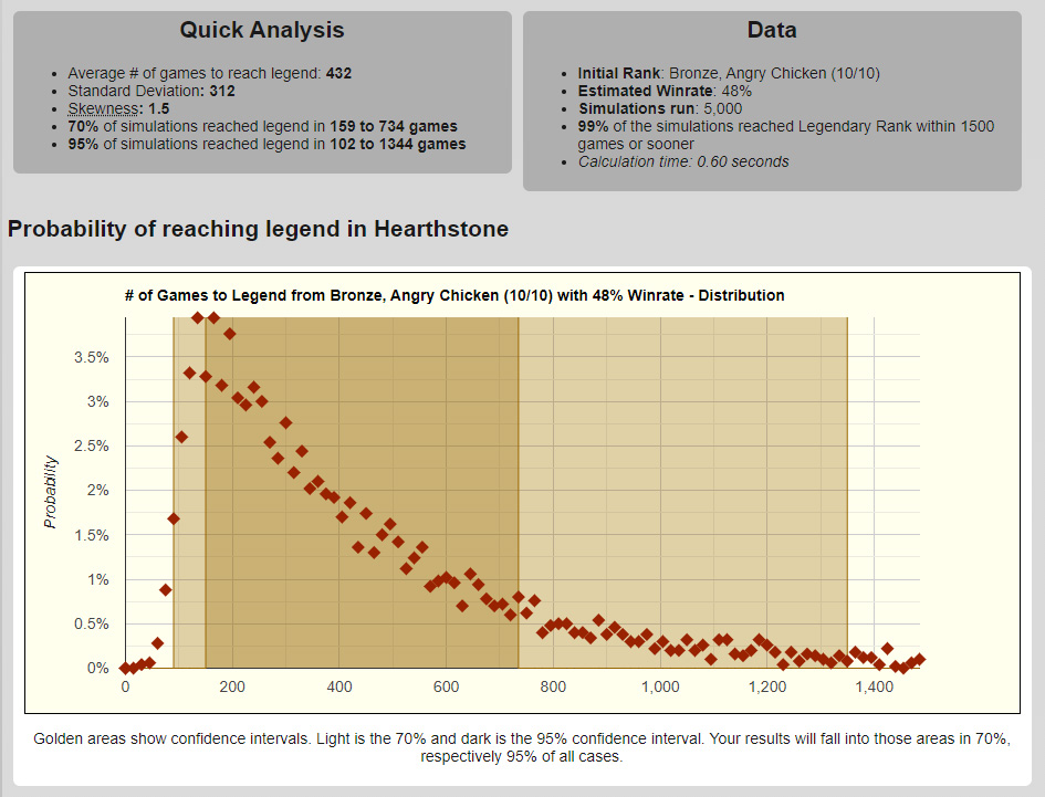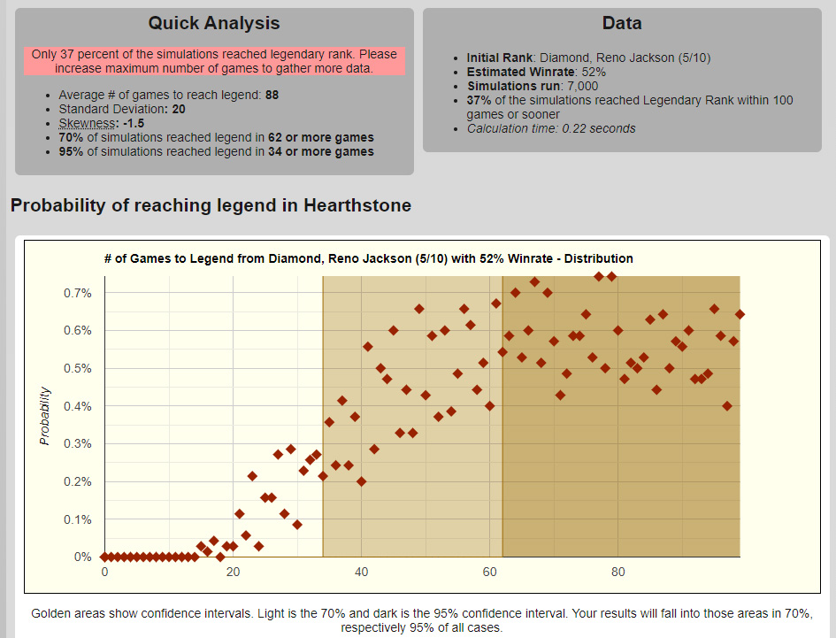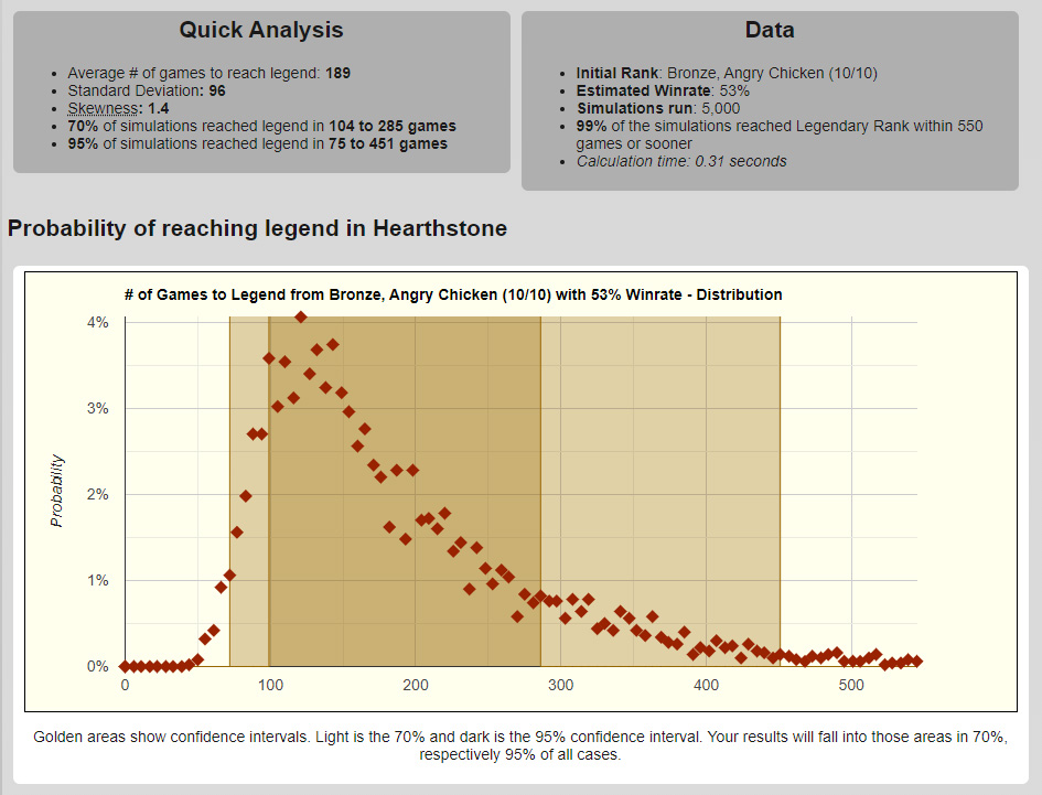 На графике также можно заметить 2 области: светло-золотую и темно-золотую. Темно-золотая область — это 70% всех результатов, исключая 15% самых удачных и неудачных симуляций. Светло-золотая область соответствует 95% всех результатов с исключением 2.5% с обеих сторон — только 1 поход из 20 не попадает в нее. Если говорить числами, то в 70% самых распространенных случаев вам понадобится провести 104-285 игр для взятия Легенды, а в более широких 95% случаев — 75-451 игр.
