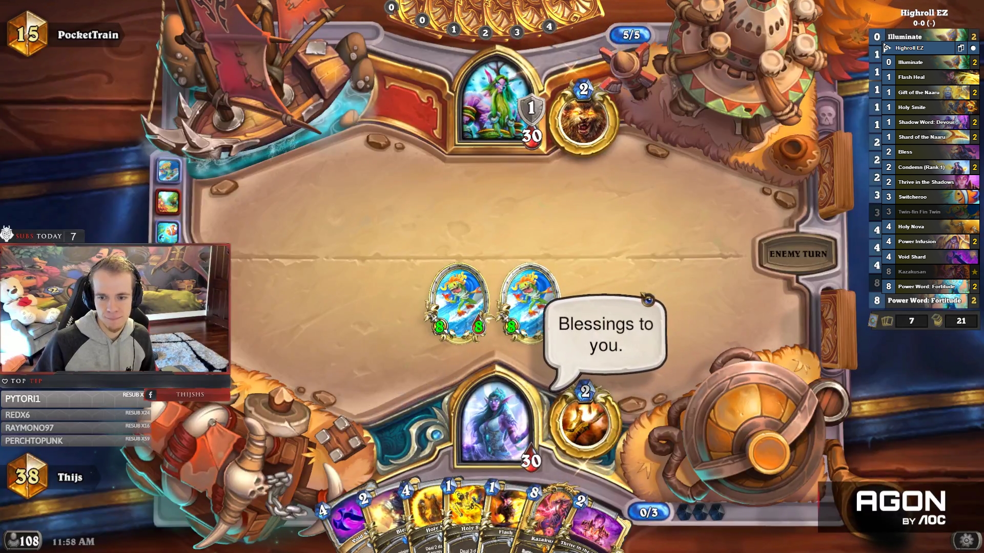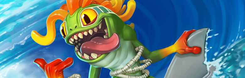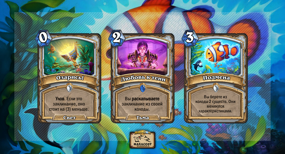 Смысл колоды в комбинации трех карт — Подмены, Смертокрыл Разрушителя и Двойного плавника. Подмена достает двух единственных существ из колоды, меняет их характеристики местами, и вы можете поставить двух мурлоков 12/12 с натиском, в идеале уже на 2-3 ход. Это единственный способ победы Жреца, но на удивление стабильный.