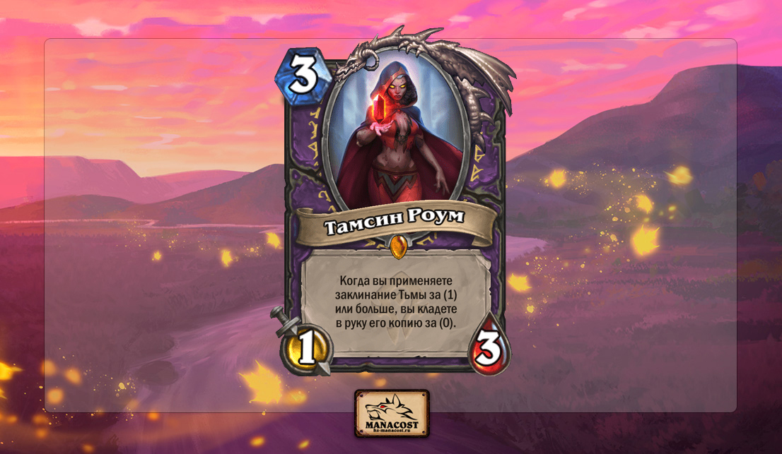 Вряд ли слабая карта, несмотря на скромные характеристики для третьего дропа. Дело наоборот в том, что Тамсин Роум может быть слишком сильной и даже токсичной. Если Магическое светило не могло опустить стоимость карт до 0, Тамсин Роум делает это постоянно и вне зависимости от их стоимости. К тому же она удешевит то, что хочет Чернокнижник: игроки уже теорикрафтят безумные комбинации с Тамсин Роум и заклинаниями Тьмы в Стандарте и в Вольном.