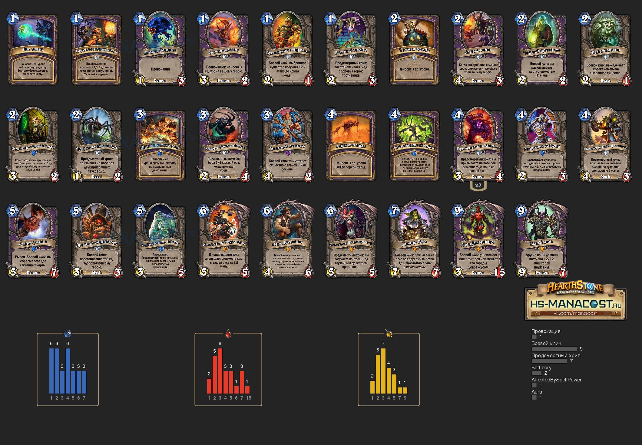 Это самая инновационная колода за последнее время, и поэтому я бы хотел начать именно с нее. Это Зоо Чернокнижник, который борется за контроль стола и подавляет противника при помощи выгодных разменов и липких существ. Но также у колоды есть надежная подстраховка в виде Рено Джексона. Однако, не это его главная задача. Главная задача Рено в том, чтобы позволить нам перерыть всю нашу колоду и не волноваться о показателе здоровья. Важная заметка: Страж гнева здесь только потому, что в ранней стадии игры он может разменяться почти со всем, а здоровье для нас не так важно. Однако, не стоит играть его против Воина с большим количеством брони, или в поздней стадии игры, когда он может быстро набрать броню. Один Мощный удар щитом в вашего Стража гнева может принести неожиданную смерть (со мной такое случилось, когда Страж гнева выпал из Пилотируемого крошшера).