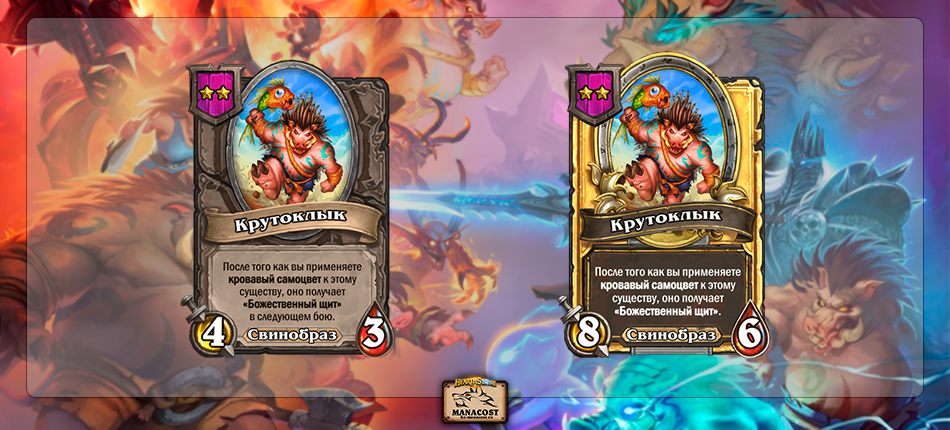 Крутокрык — отличная цель для баффов Кровавых осколков и просто угроза с высокими характеристиками для тир-2 существа. Может продержаться на столе вплоть до лейтгейма из-за божественного щита. Хорошо вписывается не только в столы со свинобразами, но и в гибридные композиции.