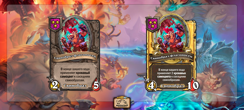 Свинобраз-флагоносец — автопик в ситуации, если на столе есть два любых свинобраза или один из перечисленных выше. Работает сам по себе, не требует сложных условий и дает высокие характеристики. Находите его вместе с Дыбогривом-громилой или Крутокрыком — и вас уже не остановить.