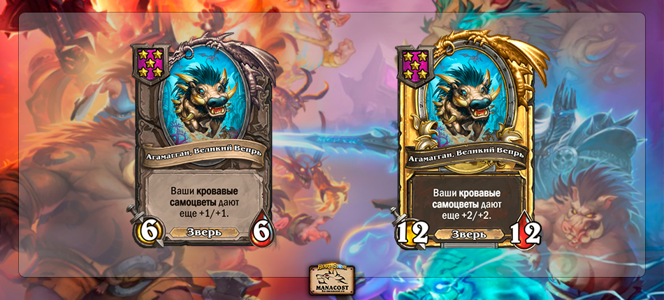 Агамагган Великий Вепрь — делает Кровавые самоцветы в два раза сильнее. Стоит брать всегда, если вы стабильно генерируете 3+ Кровавых самоцвета каждый ход. После захода этого зверя можно играть через свинобразов вплоть до конца игры: они вырастут до огромных характеристик.
