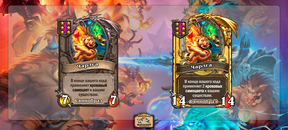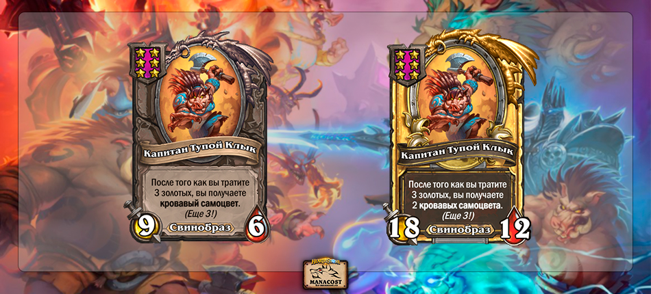 Чарлга и Капитан Тупой Клык — источники большого количества Кровавых самоцветов. Имбалансны, если на столе уже есть другие синергии свинобразов. Но эти тир-6 угрозы неплохо вписываются и в другие композиции.