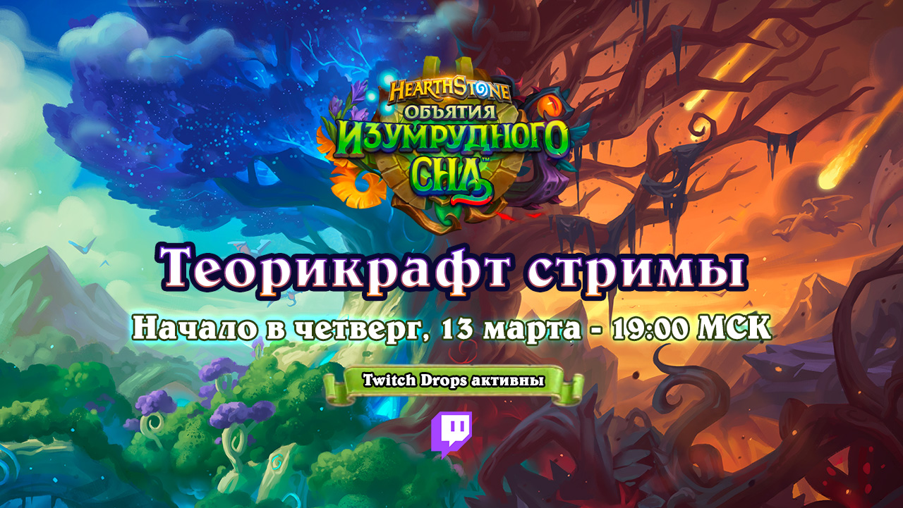 За просмотр стримов по Hearthstone в ближайшие сутки вы сможете заработать до 2 комплектов Объятий Изумрудного Сна (по одному за час просмотра). В зачет пойдут абсолютно любые трансляции, даже те, которые не участвуют в теорикрафте (например, по Полям сражений). Не забудьте привязать ваш аккаунт Twitch к учетной записи в игре, иначе просмотр не зачтется.