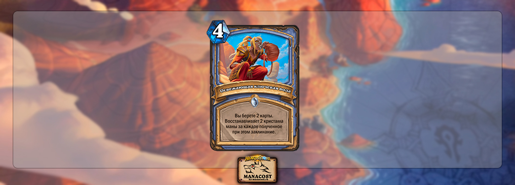 Освежающую ключевую воду нужно сравнивать с Интеллектом чародея. В большинстве ситуаций новый добор будет сильнее классического заклинания Мага. Здорово, что вы не обязаны добирать два заклинания, чтобы получить выгоду от Освежающей ключевой воды, как, например, в случае с Бесплатным проходом Чернокнижника. Даже если только одна полученная карта будет заклинанием, вы уже сможете разыграть Освежающую ключевую воду за 2 маны — это лучше, чем Интеллект чародея.