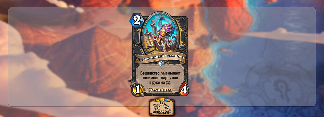 Эффект Императора Тауриссана на карте за 2 маны — что еще нужно Разбойнику? Хотя карта, разумеется, не так сильна сама по себе, как старая легендарка. Для удешевления руки нужно сделать так, чтобы Эффективный осьмибот получил урон, но не умер. Часто это станет проблемой оппонента: ему придется убивать этот второй дроп за один удар — в начале партии это не так-то просто.