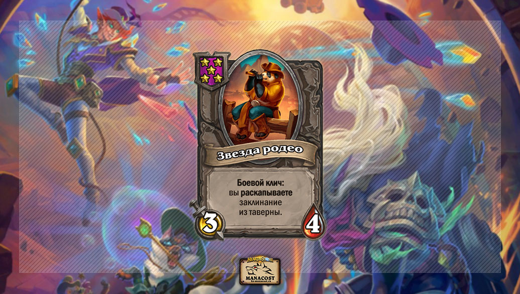 Звезда родео — очень простое существо с понятным и относительно предсказуемым эффектом. Звезду родео можно брать практически в любых ситуациях. Довольно высок шанс найти заклинание, которое сгенерирует ресурсы и даст шанс найти что-то полезное, при этом Звезда родео практически окупит себя. Другой вариант — вы раскопаете Заклинание таверны за 3-6 монет, что тоже очень выгодно.