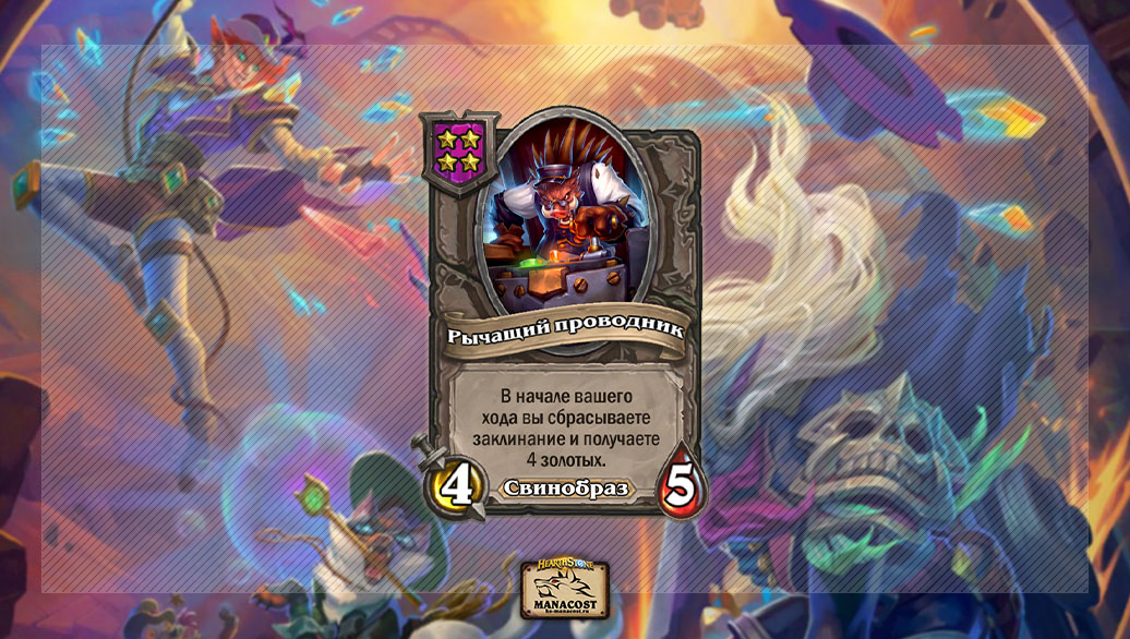 Рычащий проводник получил бафф к золоту в последнем патче. Его точно не стоит брать в любой ситуации, но теперь этот свинобраз подойдет не только столам того же типа. Его можно взять, даже если других свинобразов на столе нет, но есть какое-то заклинание в руке. Это могут быть Кровавые самоцветы, Монетки, недорогие Заклинания таверны, а также баффы провокации от Слизеныша-гладиатора. Вариантов реализации Рычащего проводника очень много, а бонусные 4 монеты помогают быстро взять 5-6 уровни таверны. Обычно Рычащего проводника берут только в середине игры на несколько ходов, и после этого продают. Только столы свинобразов могут оставить Рычащего проводника и до лейтгейма.