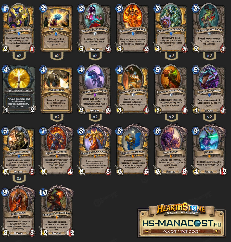 В зависимости от ситуации в мете и ваших личных предпочтений в колоде возможны замены. Такие карты, как второе Освящение, Владыка Смертокрыл, Рагнарос Слуга Света могут быть заменены на второго Хранителя Ульдамана, Элизу Звездочёт или Возложение рук. Владыка Смертокрыл – довольно ситуативная карта для поздней стадии игры, может хорошо сыграть в связке с Хромаггусом и Изерой, но она не позволит вам разыгрывать боевой клич некоторых драконов, что значительно урезает их эффективность.