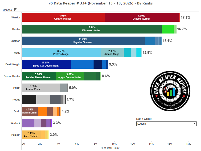 Охотник на раскопке был абсолютно не у дел перед патчем, но воспользовался отсутствием сильных конкурентов, которое образовалось после массовых нерфов, и забрался на вершину меты. Колода постепенно захватывает топ Легенды, и крайне вероятно, что ее численность превысит 30% в ближайшее время. Единственные новые карты в колоде — это сестры Ветрокрылые, и они внесли в нее большой вклад. Фейс Охотник встречается редко и не привлекает внимание игроков с момента релиза Потоков времени.