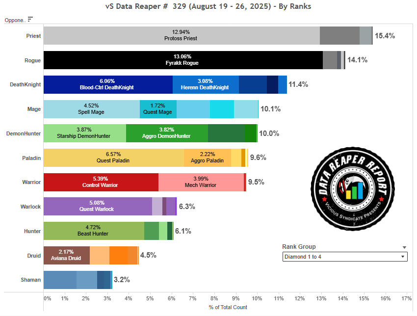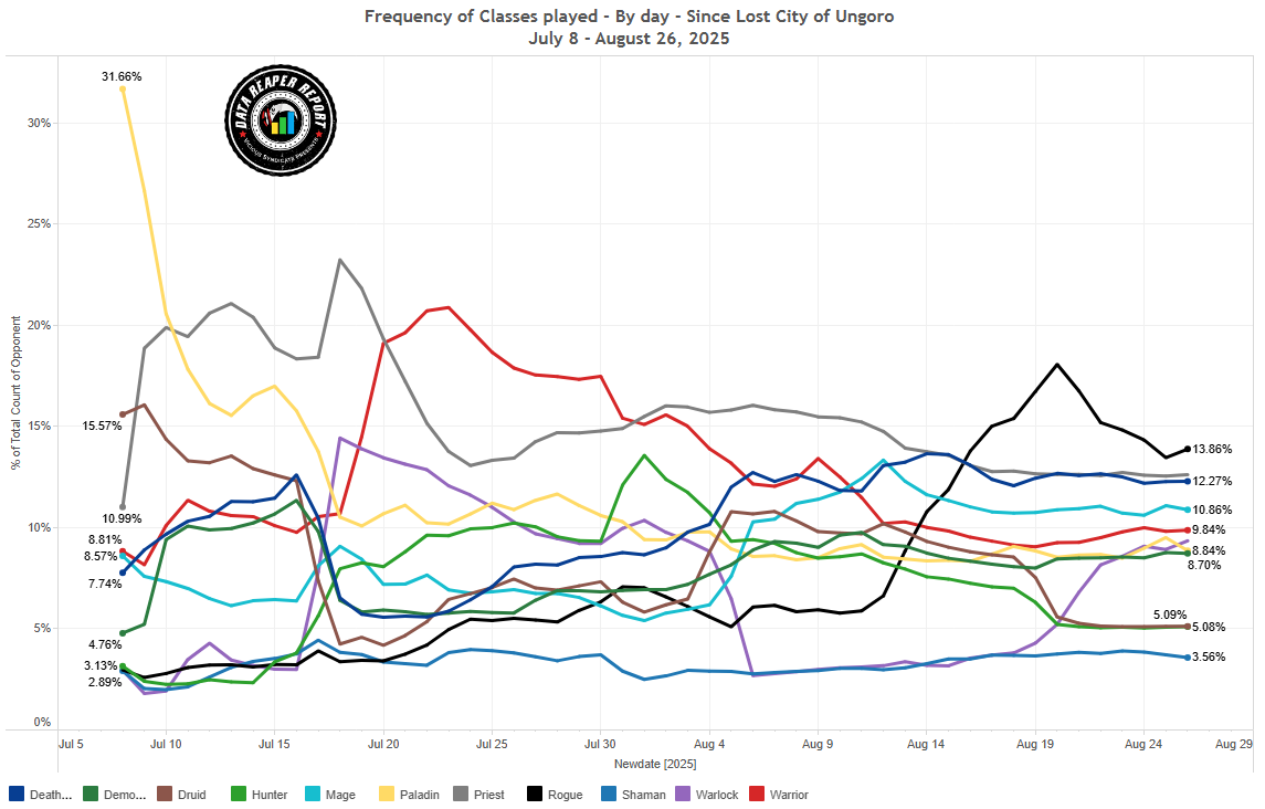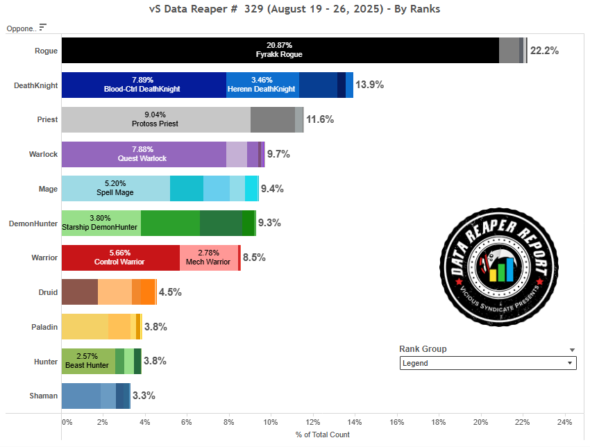 Квест Чернокнижник стал расти на фоне спада СПД Друида — одного из его самых сложных противников перед патчем. Сейчас Квест Лок — вторая по популярности колода на вершине Легенды с 20% плейрейта, уступающая лишь Фиракк Разбойнику. Самая популярная сборка наконец-то определилась и расходится по остальным рангам. Звездолет Чернокнижник тоже приподнялся в топе Легенды, но лишь слегка.