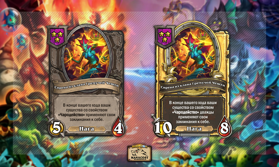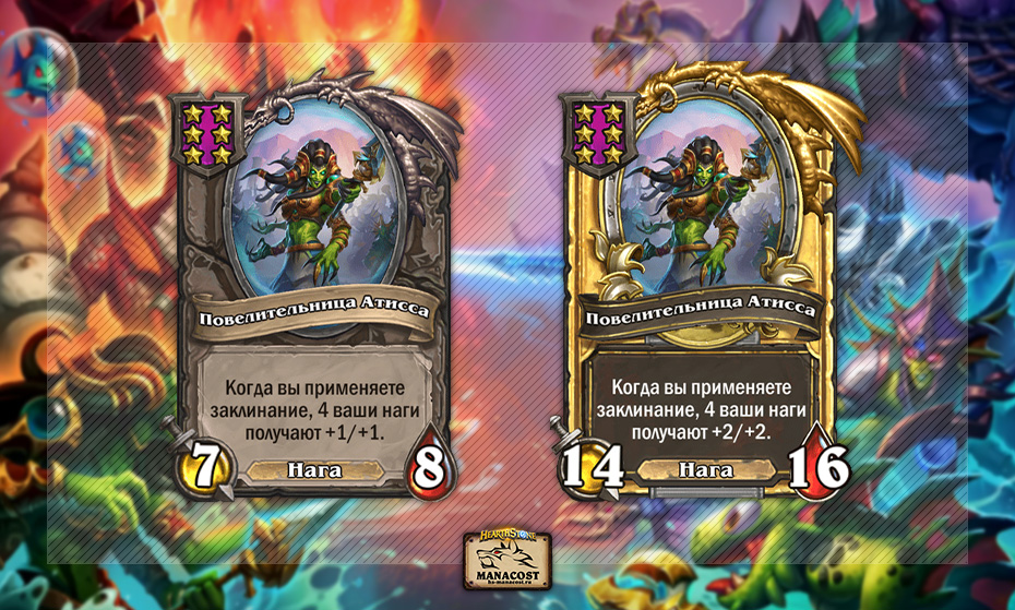 Эта нага вызывает огромные проблемы в мете. Ее эффект слишком сильный, не просто потому что баффает всех наг с чародейством, а из-за того, что активирует эффекты Повелительницы Атиссы и Погонщика зверьков.