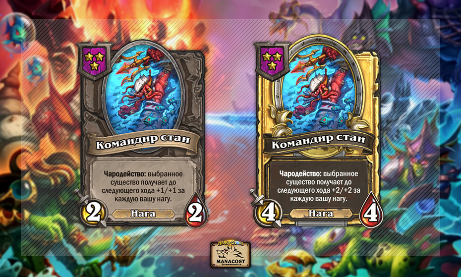 Командир стаи — один из самых сильных представителей наг с чародейством. Странно видеть это существо на 3-м уровне таверны, в то время как Угревой стрелок и Укротитель волн находятся на 4-м — их баффы куда слабее, пусть и работают на столах без наг.
