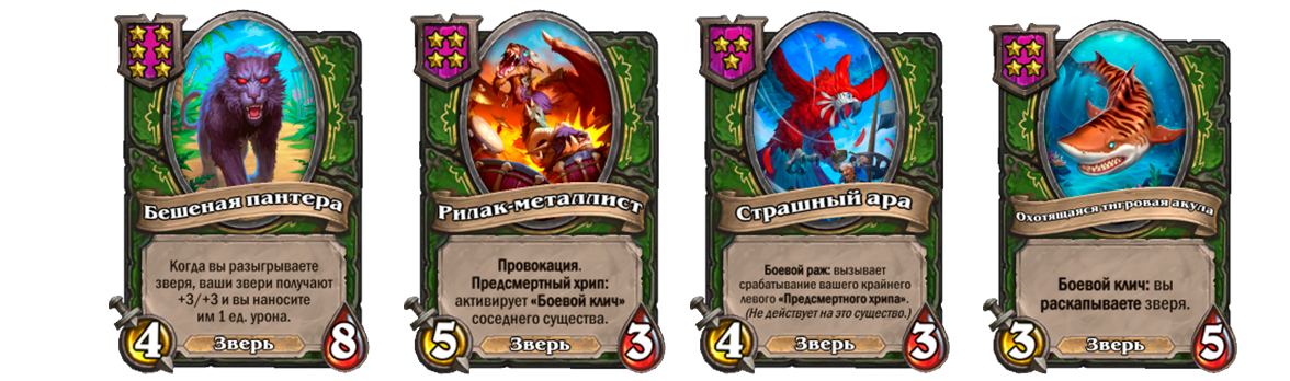 Эта стратегия появилась только в нынешнем сезоне из-за выхода ключевых карт — Бешеной пантеры и Охотящейся тигровой акулы, хотя сама механика через получение урона другими зверями уже знакома игрокам. Главная комбинация — бесконечный розыгрыш зверей, пока Бешеная пантера в связке с Радужным огнесветом или Выносливой косаткой усиливают ваш стол. Рилак-металлист и Охотящаяся тигровая акула генерируют большое количество существ в руку, поэтому в этой стратегии также уместны Тит Ривендер и Бранн Бронзобород.