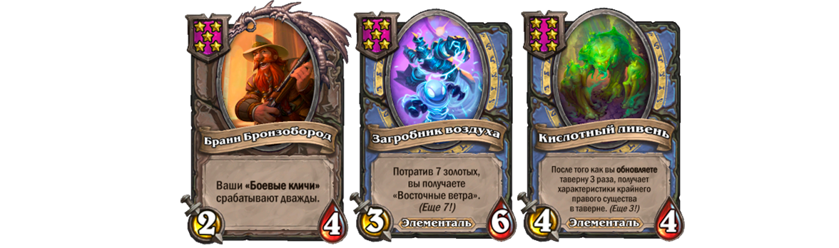 У элементалей сейчас есть два пути раскачки существ в таверне: через Номи Грозу Кухни или через новую механику усиления правого существа. Второй вариант сейчас перспективнее и входит в топ сильнейших стратегий меты. В основе стола находятся Бранн Бронзобород, Загробник воздуха и Кислотный ливень. При трате 7 золотых Загробник воздуха дает заклинание «Восточные ветра», которое баффает существо в правой части таверны.