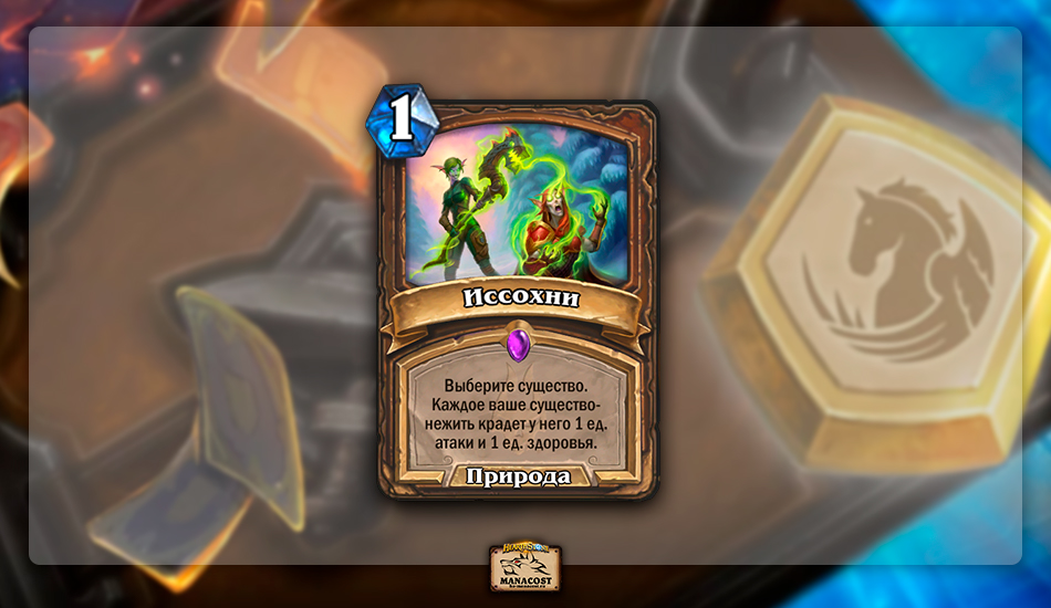 В Марше Короля-лича Друид получил синергии нежити. Карт было несколько — и Иссохни, пожалуй, самая интересная из них. Эффект воровства характеристик в принципе достаточно редкий для Hearthstone — и тем более для Друида. Но реализовать Иссохни сложно: для этого нужно поставить на стол много существ-нежити. И Друид, увы, так и не смог найти колоду, которая могла бы провернуть такое и реализовать этот спелл — одновременно и массовый бафф, и ремувал.