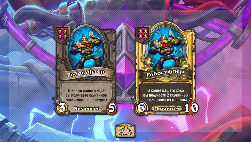 Новые синергии мехов пока не стали чем-то имбалансным и сломанным, но это не значит, что среди них нет хороших и универсальных карт. Даже если вы не играете мехами, Робосуфлер — просто хорошая карта, которая может постоять на любом столе в мидгейме. Случайные Заклинания таверны особенно хороши, если вы берете 5-6 уровни таверны, потому что на этих тирах много дорогих и полезных спеллов.