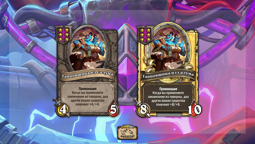 Танцовщица из салуна — это Налаа на максималках. Больше не нужно собирать какие-то столы с юнитами разных типов — вы просто берете этого юнита и наслаждаетесь. С одной копией многого не сделать, но 2+ Танцовщицы из салуна — уже хорошая основа стола. Осталось найти или какие-то генерации Заклинаний таверны (их сейчас в мете много) или экономику вокруг Бранна, благодаря чему можно покупать много карт за ход, в том числе Заклинания таверны. Вообще Танцовщицу из салуна можно увидеть и на столах мехов, и мурлоков, и пиратов, и других типов существ. Тут ограничением станет только ваша фантазия.