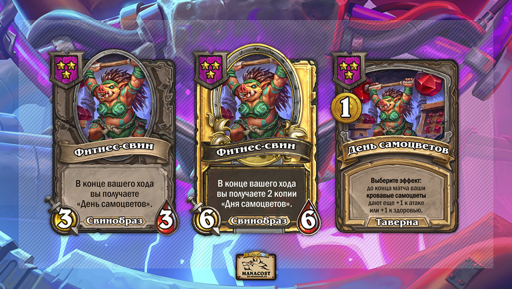Карта, благодаря которой свинобразы работают. Станет автопиком, если вы видите ее в ходы с 6-8 монетами, а часто и дальше по игре, если есть какие-то предпосылки для игры свинами. Если уже ими играете, то оставляйте Фитнес-свина до конца игры, ищите золотую версию, Чародейку драккари и, конечно же, любые способы баффать как можно больше Кровавых самоцветов. Другие способы баффать сами Кровавые самоцветы вам не нужны.