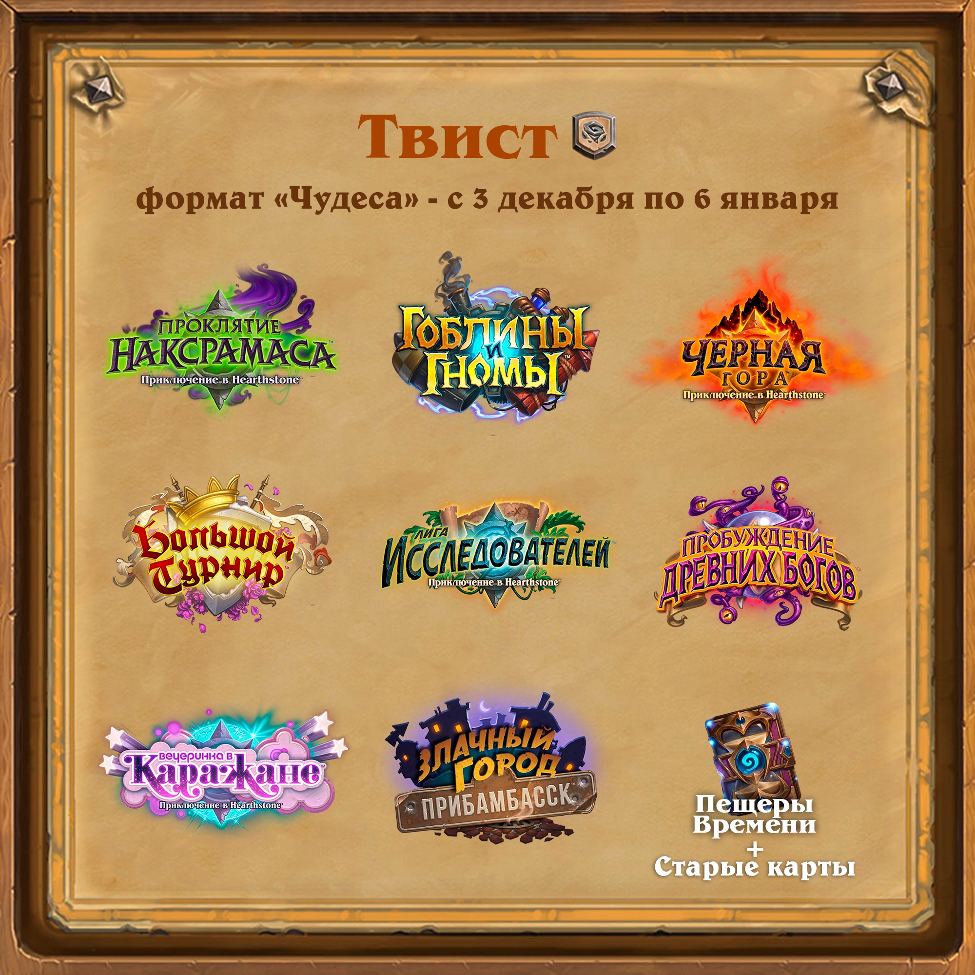 Твист вернулся в игру после долгого перерыва, и декабрьский сезон начинается с уже знакомого формата «Чудеса». Этот формат представляет из себя классический Hearthstone с ограниченным набором дополнений: