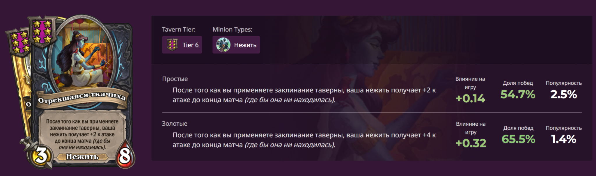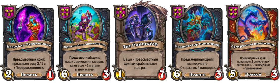 Повышайте уровень таверны до четвертого, там находятся все нужные карты. Основу стратегии составляют Реаниматор панцирей и Дружелюбное привидение, их мы и ищем на четвертой таверне. Выходить в пятый уровень рекомендуется в случае, если не получилось раскопать Тита Ривендера с награды за триплет. В таком случае стараемся найти его там и по возможности сделать его триплет. Выходить в шестой уровень таверны рекомендуется в поздней стадии игры и в таком случае включить в свою армию Отрекшуюся-ткачиху.