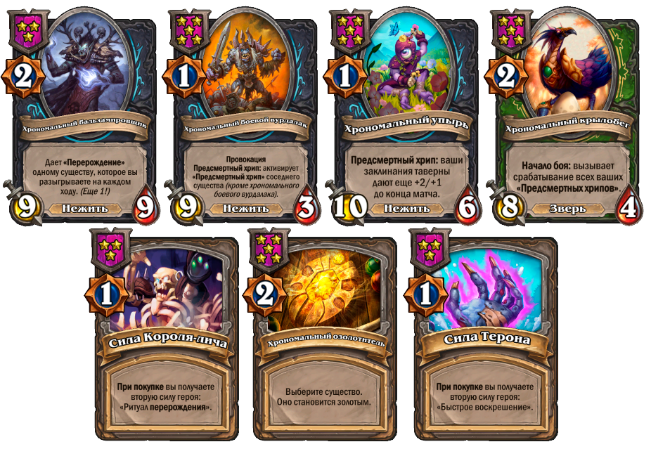 Хрономальный упырь. По сути это усиленная версия Дружелюбного привидения. Если у Привидения предсмертных хрип улучшая атаку заклинаний таверну, то у Упыря улучшается еще и здоровья. В случае если на столе не будет хватать места для необходимой карты, как правило, лучше будет продать Привидение, а Упыря оставить.