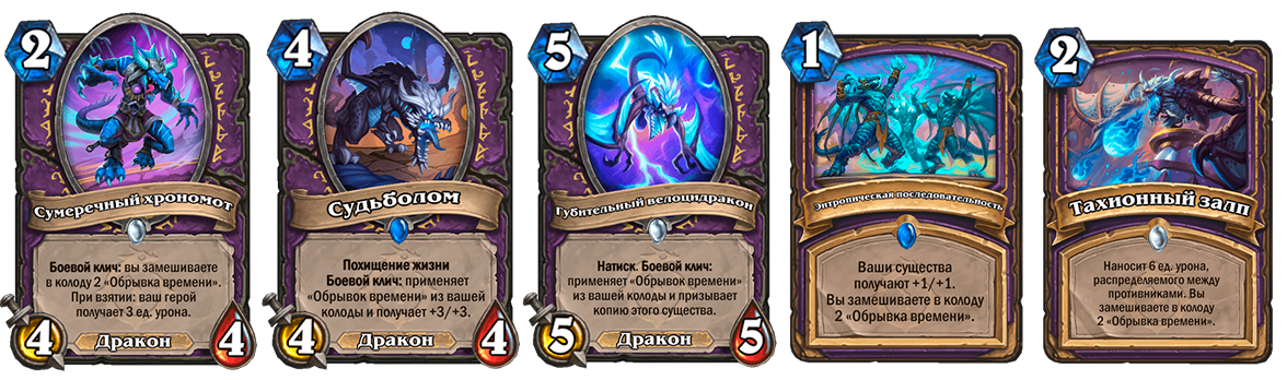 Обрывки времени нужны колоде для агрессивного старта и развития наступления на оппонента. Сумеречный хрономот — лучшая карта на второй ход, но взамен он замешивает два Обрывка в вашу колоду, которые при взятии наносят вам урон. Вы получаете много статов, а негативный эффект не только не мешает, но и должен помочь.