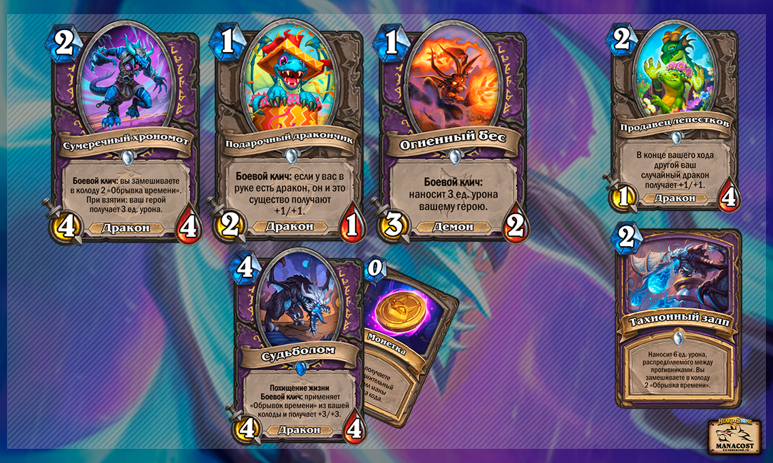 У новой механики всего лишь 2 основные синергии, но зато какие. Судьболом — опасная четверка при активации, особенно выставленная через Монетку. Похищение жизни — приятный бонус, который не всегда будет полезен, но пригодится время от времени. Губительный велоцидракон дает очень уверенный контроль стола, позволяет обойти провокации и перехватить стол, если вы начнете его терять.
