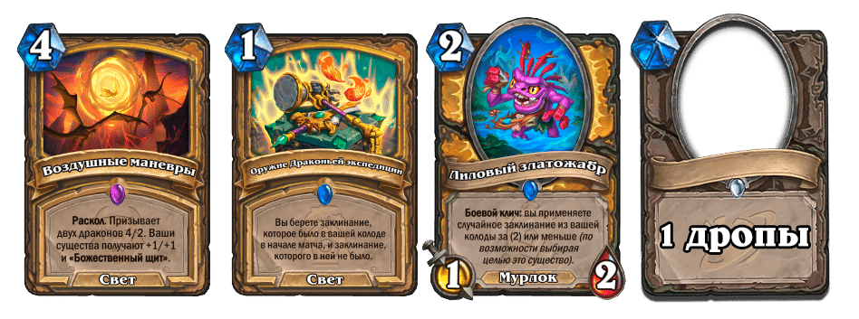 Именно поэтому на муллигане мы всегда ищем её в первую очередь. Если игра не предлагает её в стартовой руке, нужно оставлять карты, которые помогут её добрать: Оружие Драконьей экспедиции и Лиловый златожабр.