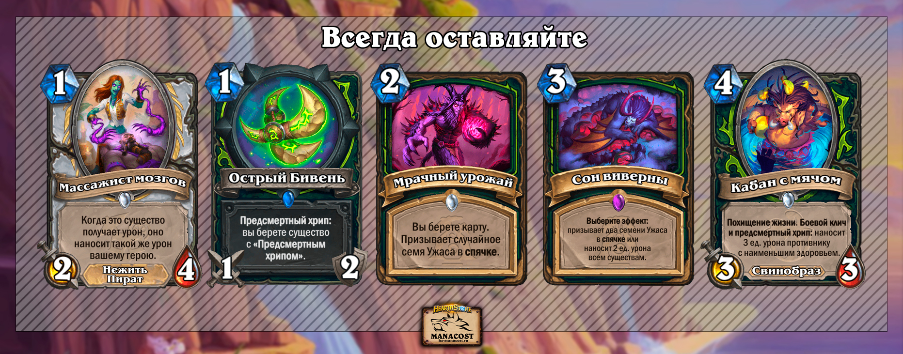 - Всегда оставляйте: Массажист мозгов, Острый бивень, Мрачный урожай, Сон виверны, Кабан с мячом.