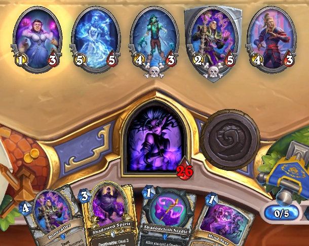 Если эффекты воскрешения и других заклинаний активировать не нужно, старайтесь размениваться не существами, а другими источниками: силой героя, Иссушением разума, Иглой для тенетками, Осколком Бездны и Словом тьмы: несмертие. В редких ситуациях Андед Жрец хочет атаковать своим существом по существу противника, если не для активации спелла в руке, воскрешения или в начале партии против темповой колоды.