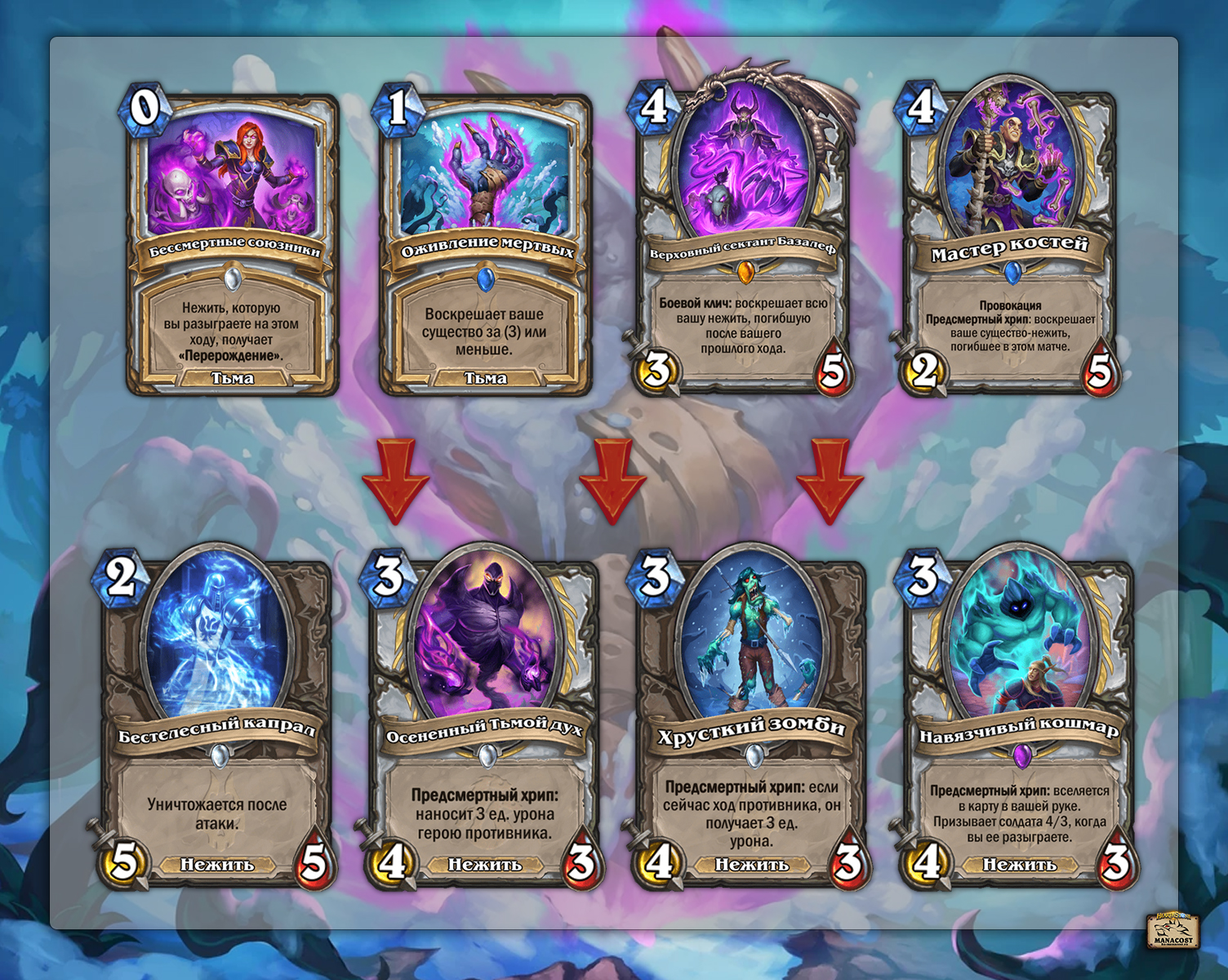 Так много нежити в колоде Андед Жреца преимущественно из-за пяти карт — Бессмертных союзников, Верховного сектанта Базалефа, Разрывания могил, Гниющего некроманта и Слова тьмы: несмертие. Всё это ключевые карты в колоде, которые и сделают Андед Жреца сильной и даже имбалансной декой.