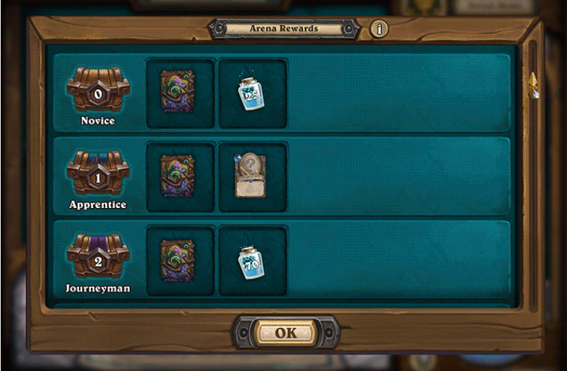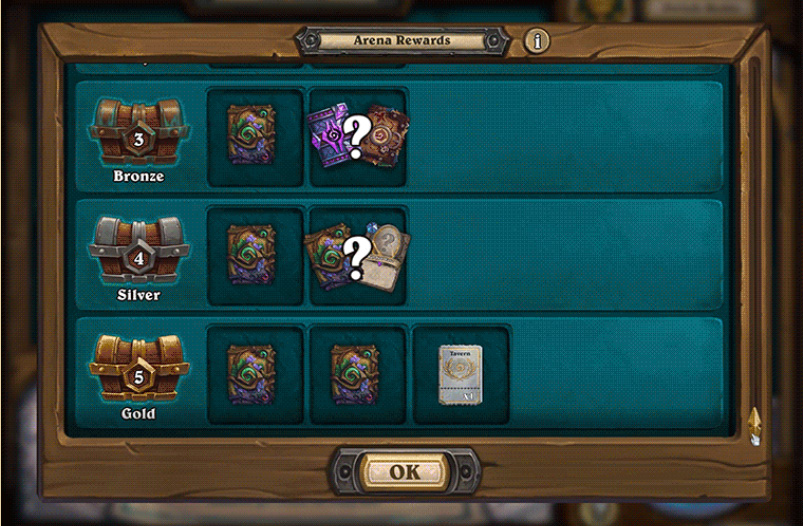 Вступление на обычную Арену будет стоить 1 пропуск в таверну, и вы сможете сыграть на ней до 5 побед или 2 поражений. Награды теперь включают комплекты карт последних дополнений, а за лучший результат вы получите новый пропуск в таверну. Все верно: хороший результат принесет вам еще один новый поход.
