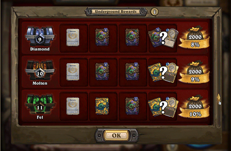 Тех, в ком кипит дух соревнований и кто хочет блеснуть своими навыками составления колоды, ждет Подполье! Докажите, что достойны серьезной игры, победив в семи непоследовательных матчах на обычной Арене (с любым числом поражений между победами), и тогда вам откроется Подполье. Это более сложный и рисковый формат с большими наградами.