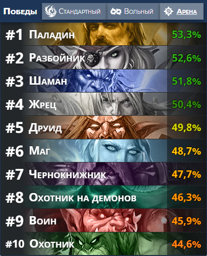 Жрец остается самым одним из самых непопулярных классов в Стандартном режиме игры, на Арене же Андуин показывает неплохие результаты, замыкая список классов-лидеров по винрейту.