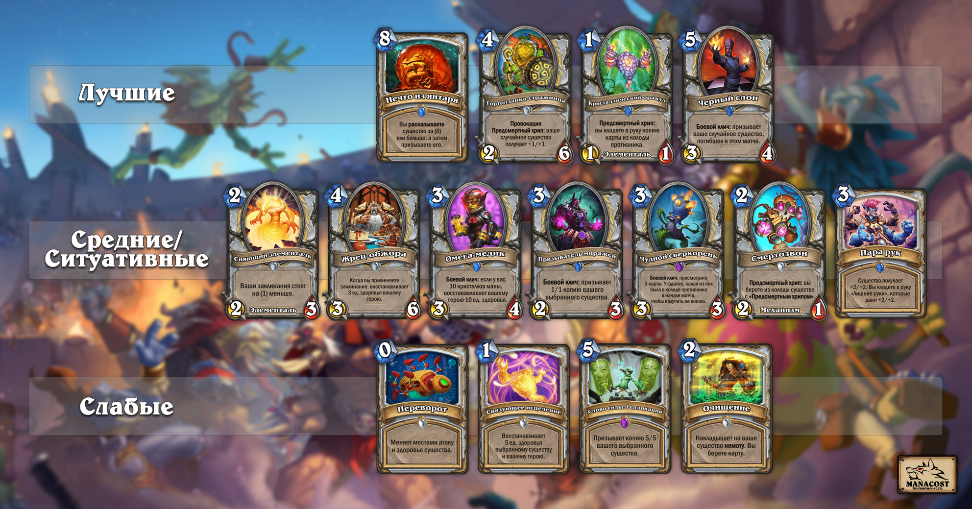 К хорошим картам можно отнести Нечто из янтаря, Тортолльскую стражницу и Кристаллического оракула. Нечто из янтаря вместе с Драконоведением являются для Жреца одним из способов получить на Арене Дракона-беглеца — эта карта забанена на этапе сборки колоды.