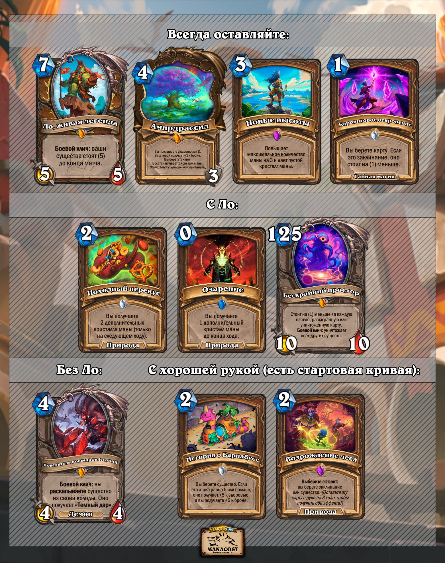 Как и многие Рамп Друиды из прошлого, Ло Друид очень любит, когда игрок постоянно планирует свои действия наперед. Иногда это сложно или нудно, но делать это нужно — ваши результаты станут на порядок лучше. Такие карты, как Озарение, Походный перекус, Новые высоты и Амирдрассил (по-прежнему одна из лучших карт Друида), вносят очень много разнообразия в то, как вы можете выстроить кривую маны, и практически в каждой партии у вас будет возможность модифицировать ее тем или иным образом. Поэтому не жалейте времени, чтобы спланировать, как вы будете действовать в той или иной ситуации. Ваша цель в любом случае — как можно раньше найти и поставить Ло на стол.