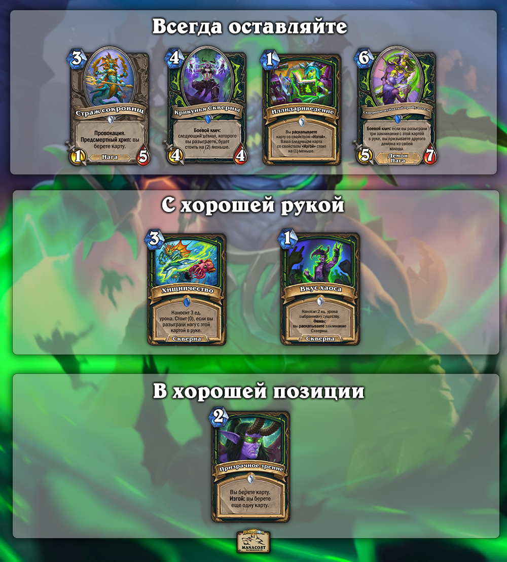 Помимо этого, в колоде есть важные карты: Крикунья Скверны, Скверночешуйчатый пробудитель, И разверзлась Скверна. С помощью них можно сыграть тяжелых демонов за меньшую стоимость. В начале и в мидгейме особенно полезны Крикунья Скверны и Скверночешуйчатый пробудитель, а спелл И разверзлась Скверна полезен уже в лейтгейме после смерти хотя бы одного демона. Вы редко сможете активировать эффект насыщения заклинания, но в этом и нет особой необходимости.