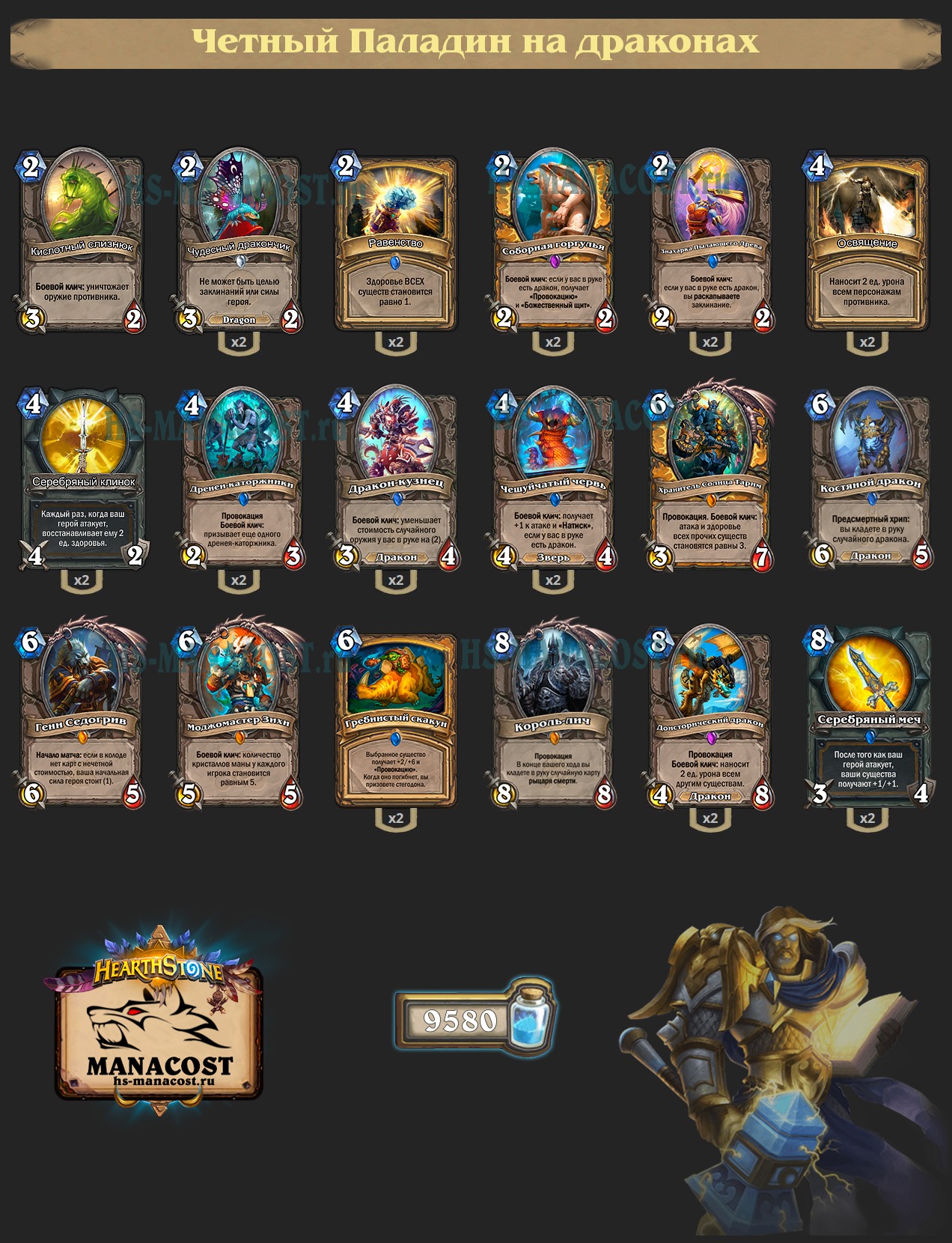 Какова главная проблема Четного Паладина? Отвратительные вторые дропы. Его лучшие существа требуют наличия драконов в руке, ведь если бы не это ограничение, они бы игрались в каждой колоде. Оправдывают ли они использование набора драконов в Четном Паладине? Да, но не сами по себе, а в компании с Чешуйчатым червем, который просто невероятно показывает себя в мете Охотников. Он убивает волков и выживает, он уничтожает Дьявозавров, вылупляющихся из яиц и призываемых Стрелой с наживкой. Эти карты делают колоду вполне играбельной. К сожалению, в игре мало четных драконов, так что приходится играть от их эффектов. Один удешевляет ваше оружие, второй уничтожает мелкие столы. Колода выглядит следующим образом: