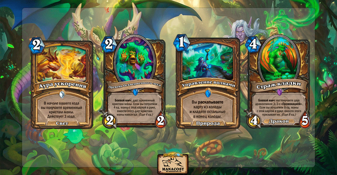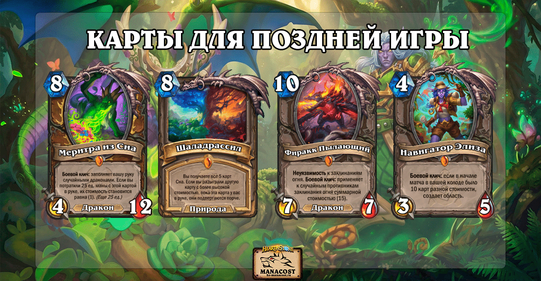 Рамп-заклинания играют не менее важную роль. В начале партии нужно как можно быстрее получить преимущество по мане, чтобы раньше соперника начать реализовывать свои карты и оказывать давление. Дополняют колоду драконы с синергией и контрольные инструменты, которые позволяют гибко адаптироваться под разных противников.