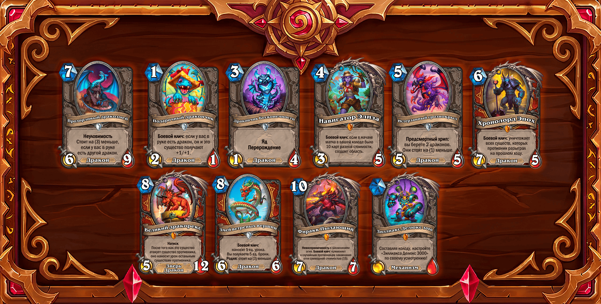 Существует множество сборок Дракон Воина: одни агрессивны уже на ранней стадии, другие используют более тяжелые карты и уходят в контроль. Как говорилось выше, колода из сегодняшнего обзора — это золотая середина между темповым давлением и вдумчивым контролем ресурсов. В колоде используется уже стандартный набор карт: Подарочный дракончик, Хранитель стаи, Продавец лепестков, Дракончик Бесконечности и другие.