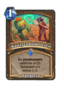 Кактусовый голем — простое заклинание, над которым не нужно много думать. И пусть так, эффект спелла очень хорош. Сила Кактусового голема в том, что это топовая карта для муллигана. На первый ход вы призываете 1/2 юнита — пусть даже без особых характеристик. А на второй ход вы сможете сыграть и раскопанное существо за 2 маны из руки. В результате один Кактусовый голем обеспечит Друида уверенным стартом и планом на два хода.