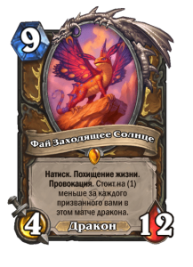 Этого дракона можно взять и в колоду с дубликатами, и без них. И в любом случае она будет очень сильной. Даже если вы снизите стоимость Фай до 5-6 маны, это уже будет имбалансная карта. А в лейтгейме ее можно сыграть и вовсе бесплатно. Важно, что Фай становится дешевле при призывые дракона, а не при розыгрыше. Значит, Голем-дракон сделает эту легендарку значительно дешевле.