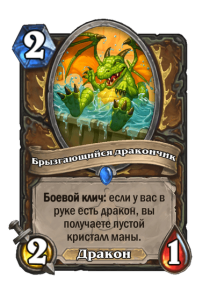 Старички помнят, как хорош был Буйный рост, когда стоил 2 маны. Спелл все еще иногда играют уже за 3. Брызгающийся дракончик — улучшенная версия старого Буйного роста за 2. В дополнение к обычному эффекту разгона по мане вы получаете и 2/1 существо, а еще это дракон в руке для других синергий этого типа существ.