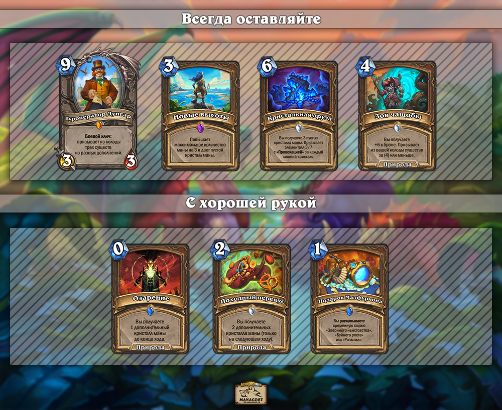 Дунгар Друид — очень простая в геймплее колода. Тут много разгона по мане, который вы агрессивно ищете на муллигане. Есть как постоянные способы разгона по мане, так и временные. И временные нужно оставлять исключительно для розыгрыша тяжелых юнитов. С умом используйте Монетку, Озарение и Походный перекус, чтобы раньше поставить Туроператора Дунгара или другого тяжелого юнита на стол.