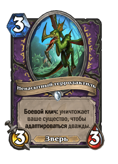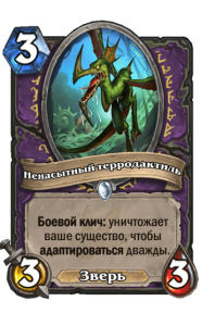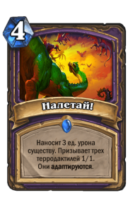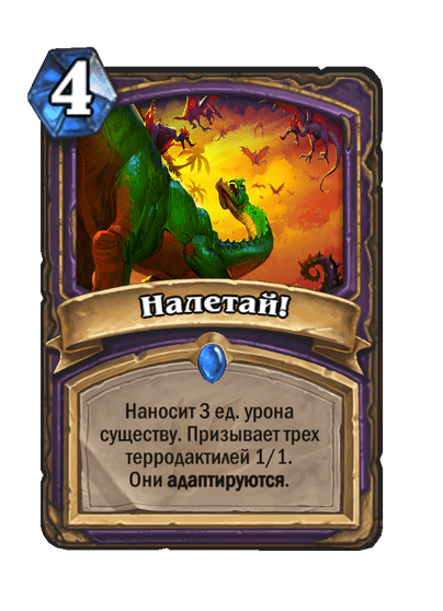 Налетай! [4 маны] Наносит 3 ед. урона существу. Призывает трех терродактилей 1/1. Они адаптируются.