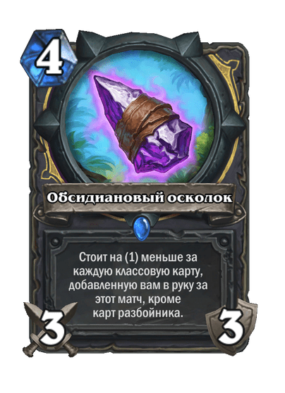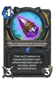 Обсидиановый осколок Стоит на (1) меньше за каждую классовую карту, добавленную вам в руку за этот матч, кроме карт разбойника.